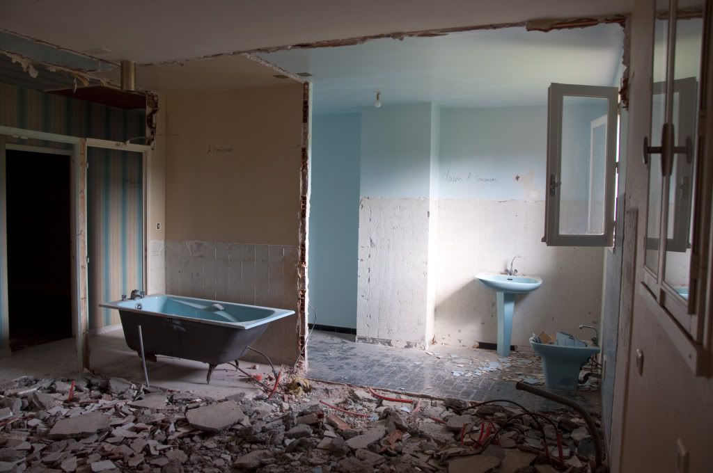 They've been back today and we now have no wall between the kitchen and the bathroom, not much in the way of a kitchen floor either. The toilet's out but there's still a bath and washbasin oh and a bidet too.